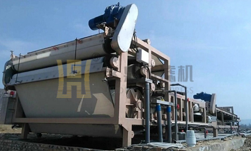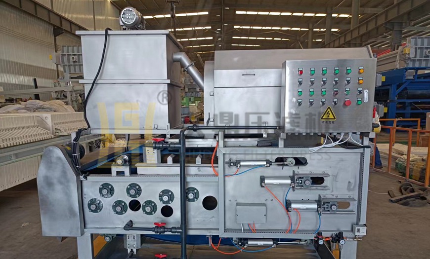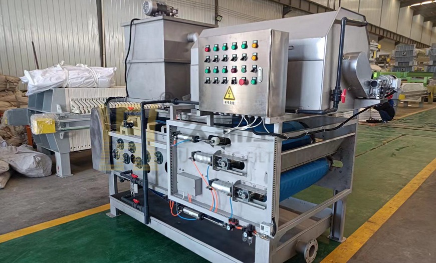 帶式壓濾機(jī)主要由驅(qū)動(dòng)裝置、機(jī)架、壓榨輥、上濾帶、下濾帶、濾帶張緊裝置、濾帶清洗裝置、卸料裝置、氣控系統(tǒng)、電氣控制系統(tǒng)等組成。