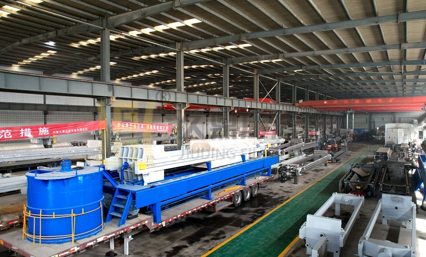 該機型由壓濾機,皮帶輸送機、入料泵、混合攪拌罐、操作平臺、雨棚等組成,泥漿在混合攪拌罐中與石灰或絮凝劑混合后由入料泵輸送至壓濾機內,在專用濾布的作用下對泥漿進行分離,形成泥餅和清水。